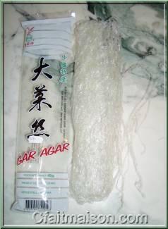 L'agar-agar, appelée aussi E406 ou kanten au Japon, est un gélifiant naturel extrait d'algues marines rouges (généralement : gracilaria et gélidium). C'est un substitut idéal à la gélatine animale et à la pectine qui a aussi l'avantage d'être pratiquement acalorique tout en étant riche en éléments nutritifs (calcium, phosphore et fer) et de faciliter la digestion. Son pouvoir gélifiant est bien supérieur à celui de la gélatine, (qui elle, est d'origine animale et ne conviendrait pas aux végétariens*).