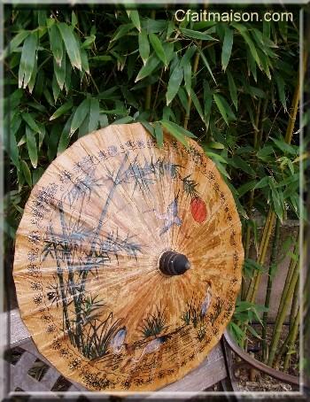 Un morceau de paille de blé séché (représentant un bambou) collé (ou agraffé si vous avez besoin d'une grande quantité de décoration) en haut et en bas d'une petite reproduction de calligraphie imprimée sur papier et découpée, vous donnera un petit objet de décoration pouvant être intégré à une composition florale, ou introduit dans un pliage de serviette ou autre décoration individuelle.