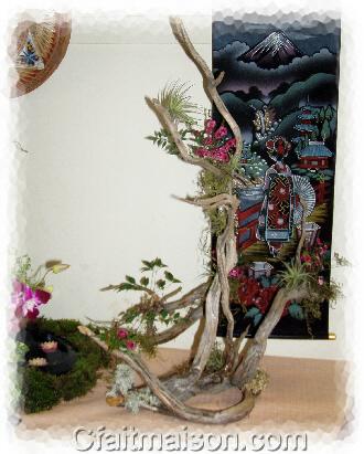 un bouquet réalisé dans un vase haut (pour composition nagière) ou très bas comme un pot à bonzaï non percé ou un plat à four (pour composition moribana) avec un pique-fleurs ou dans un vase en cloisonné,