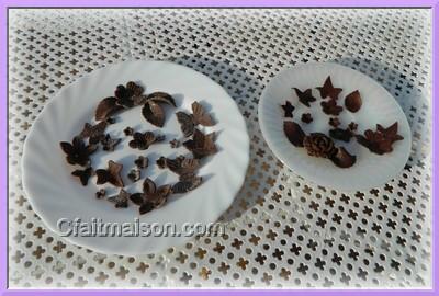 Dès que la pâte a la consistance d'une pâte à modeler ne la laisser pas sécher à l'air libre avant d'avoir façonner vos décorations. Conservez la pâte non utilisée, bien emballée au réfrigérateur pour des utilisations futures. Ne gardez sur le plan de travail que la petite quantité dont vous comptez vous servir sur le moment et réchauffez-la si besoin en malaxant la pâte entre les doigts. J'utilise des gants fins et souples de cuisine jetables pour mes façonnages en chocolat noir et la pâte ne colle pas aux gants. Les décors obtenus sèchent à l'air libre et sont plutôt fragiles. Les oeuvres devront être manipulées ou transportées avec soin.