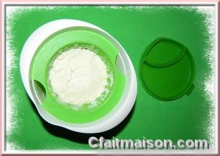 Le couvercle (vert ou jaune) réalisé dans du silicone flexible sert de doseur pour mesurer la quantité d'acide à utiliser (citron, vinaigre ou yaourt) et fait office de bec verseur pour cet ajout.
