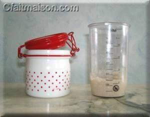 | Ajout du rafraîchi dans le bocal du chef. | Prélèvement de 50 g. de chef à mettre dans le pot du futur pain. |