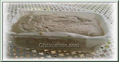 Mélanger les ingrédients pour obtenir une pâte consistante. Chemiser un moule avec du papier cuisson (car dans le cas de cette recette, le graissage est insuffisant pour permettre un démoulage correct). Verser le mélange dans le moule.